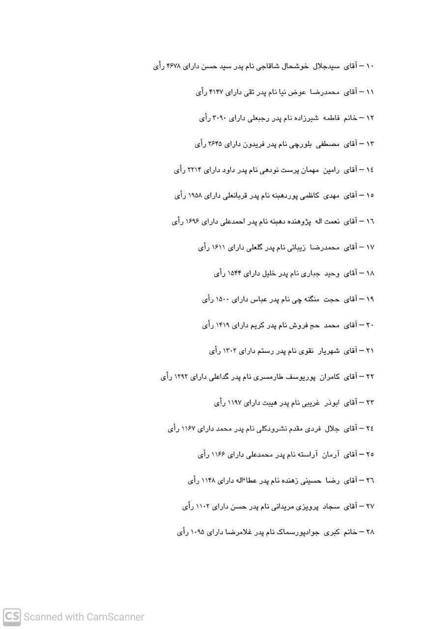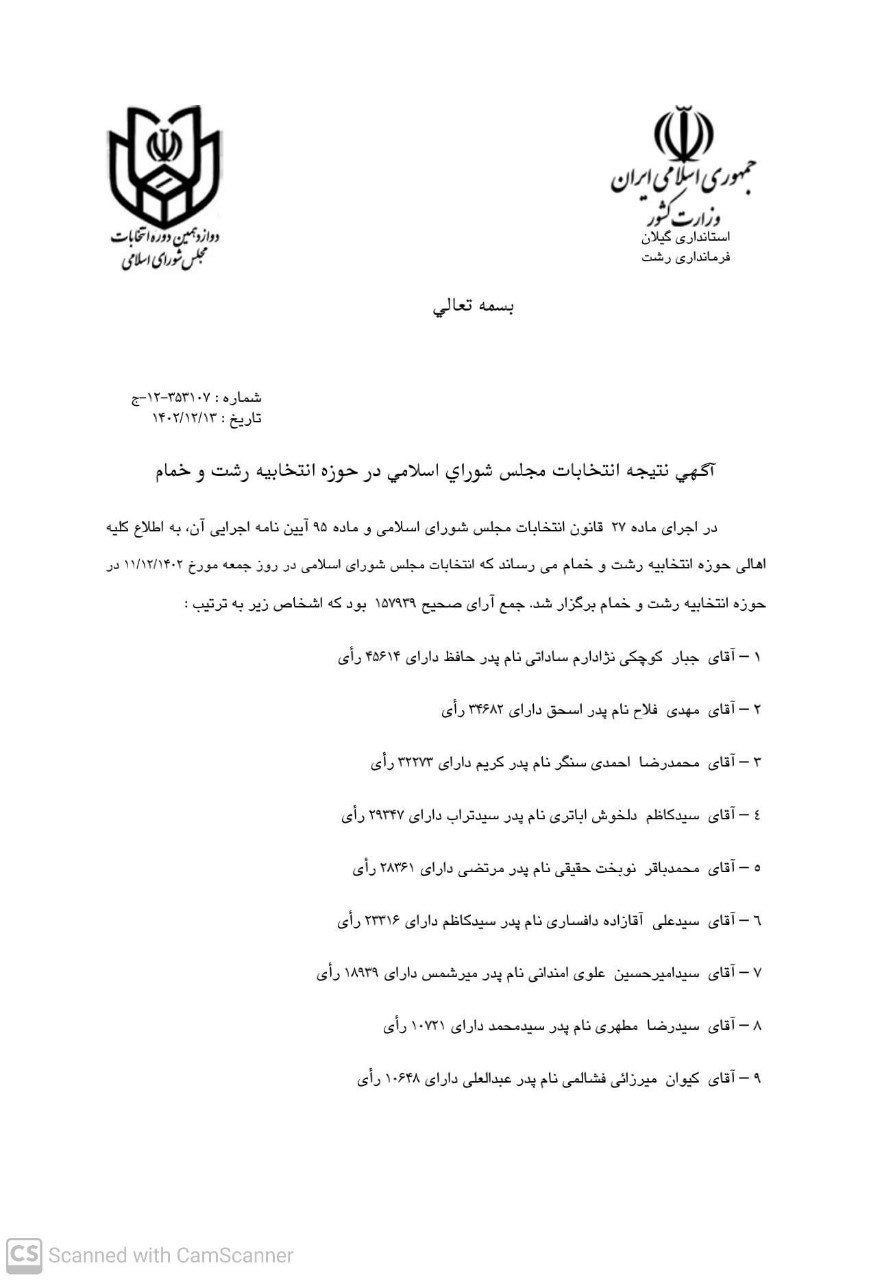 با توجه به برگزاری دوازدهمین دوره انتخابات مجلس شورای اسلامی در روز جمعه ۱۴۰۲/۱۲/۱۱ نتایج شمارش آراء نامزدهای انتخابات مجلس شورای اسلامی در حوزه انتخابیه رشت و خمام صادر می گردد.